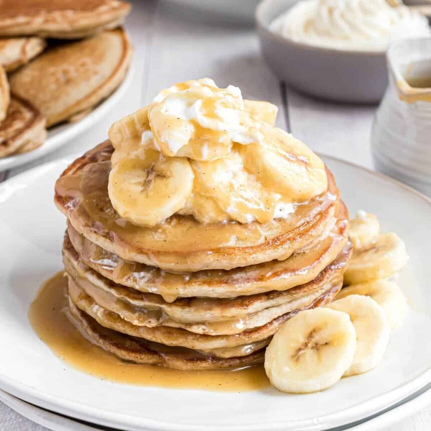 Aller à la Recette 5 à partir de évaluations Les pancakes au banoffee sont parfaits pour quand vous souhaitez que votre petit-déjeuner ait le goût d'un dessert. Des pancakes moelleux à la banane sont garnis de crème fouettée maison, de caramel fondant et de tranches de banane pour un délice…
